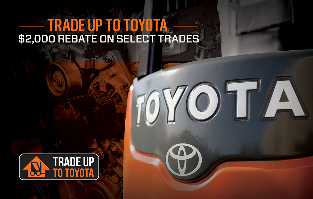 - The Trade Up to Toyota Factory Rebate is applicable on Electric & Internal Combustion counter-balanced models, Order Pickers, and Reach Trucks.