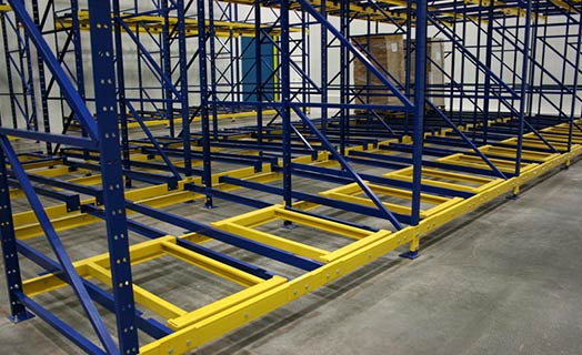 Very high density pallet storage. Pallet can be stored 2 to 14 (or more) deep.